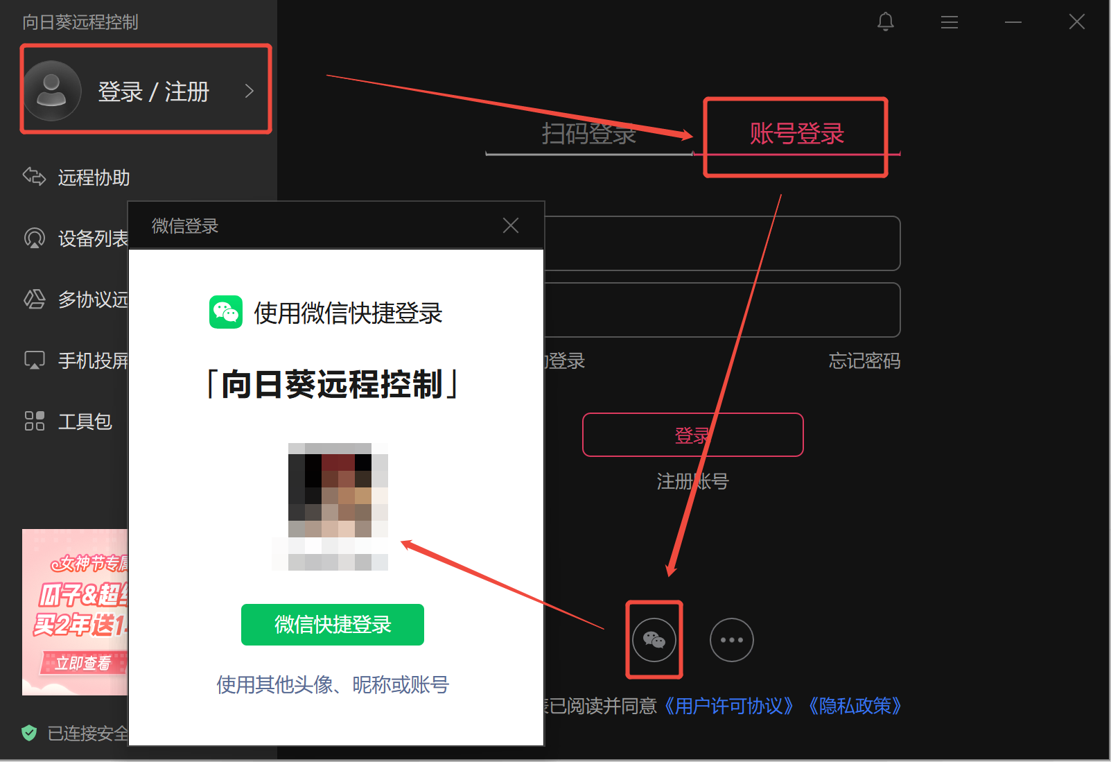 双击「向日葵」客户端——登录/注册——账号登录——微信登录